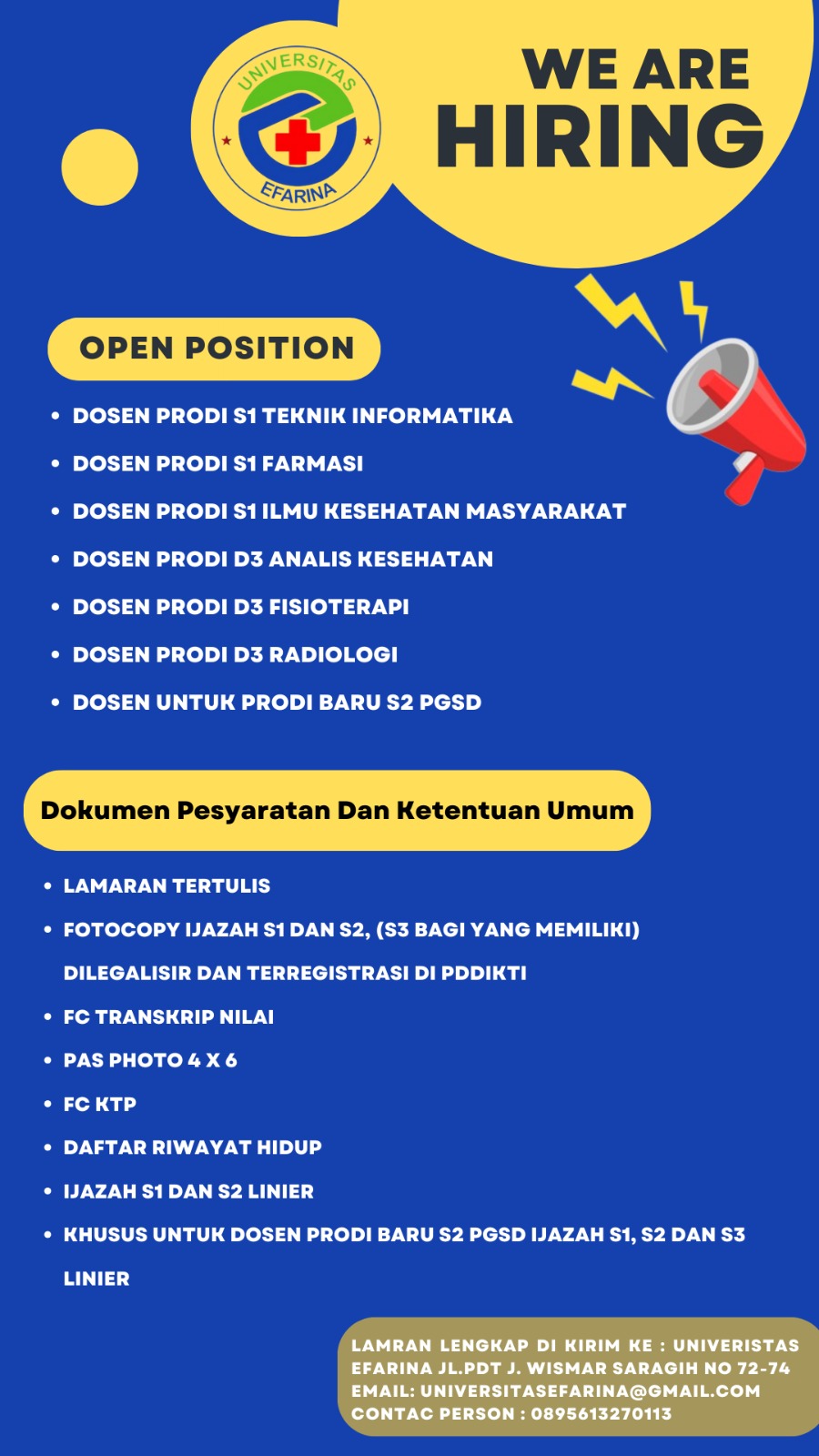 Universitas Efarina terus tumbuh dan berkembang setiap tahunnya tidak terlepas dari dukungan dan kerja keras para civitas dosen, manajemen, dan para staff pendukung. Sebagai universitas swasta menjadi tantangan besar bagi kami untuk menyelenggarakan manajemen sumber daya manusia yang berorientasi pada pelayanan, pengembangan, dan penilaian yang bermutu dan berkelanjutan.